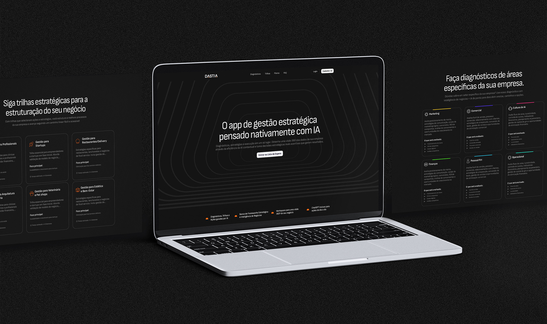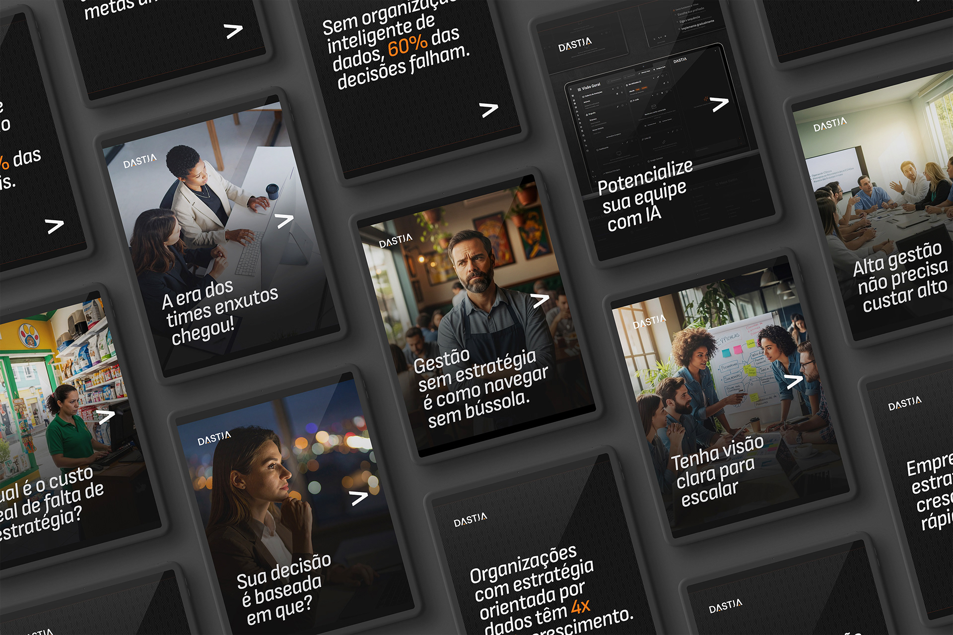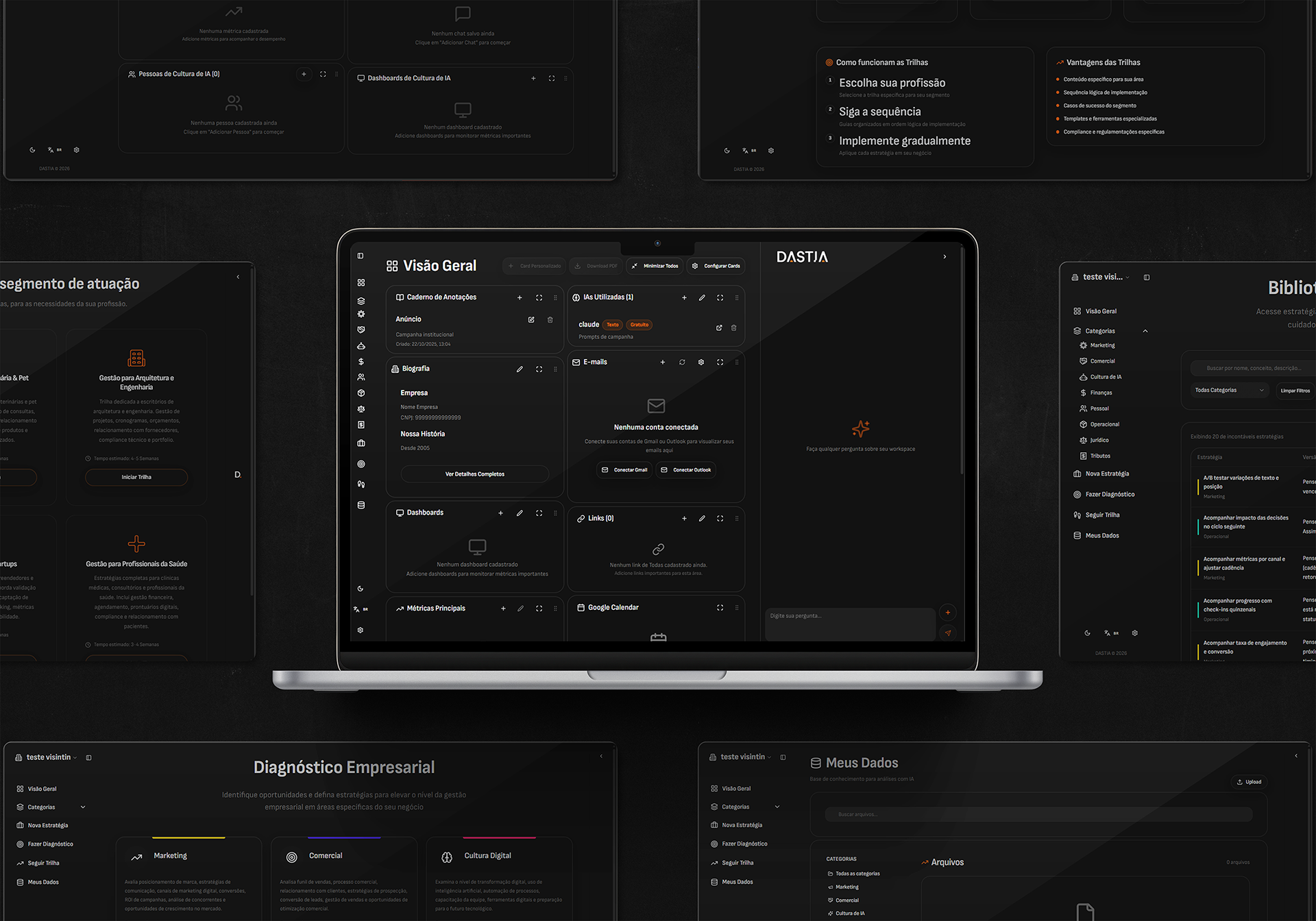 PT. Dastia é uma plataforma inovadora que democratiza a gestão de alto nível através de inteligência artificial, tornando-a acessível para pequenos e médios empresários. Posicionada como solução disruptiva em um mercado complexo e caro, a empresa combina inteligência de negócio, dados estratégicos e IA para entregar excelência técnica a custos viáveis. A marca foi construída visando transmitir a inovação e a tecnologia da empresa, de forma minimalista e objetiva. A aplicação da identidade visual na plataforma Dastia segue o conceito do design centrado no usuário, proporcionando uma experiência de usabilidade simples e intuitiva aos usuários.